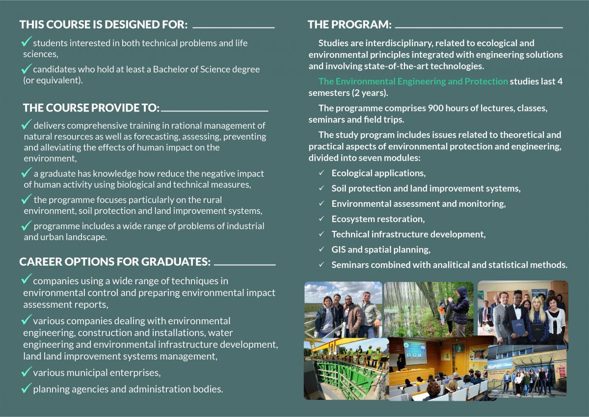 The Environmental Engineering and Protection studies lasts 4 semesters (2 years). The course comprises more than 900 hours of lectures, exercises, seminars and field trips. The study program includes issues related to the theoretical and practical aspects of protection and environmental engineering, which is divided into seven subject groups.